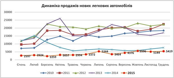 Количество зарегистрированных продаж новых легковых автомобилей в Украине в 2015 году упали на 52% до 46 546 штук.